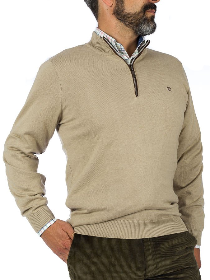Jersey caza hombre cuello alto, cierre de cremallera, corte recto, manga larga y acabados acanalados. Detalle de Antelina en cierre de cremallera y tirador de cremallera en piel, bordado en delantero. Tejido 50% algodón 50% acrílico.